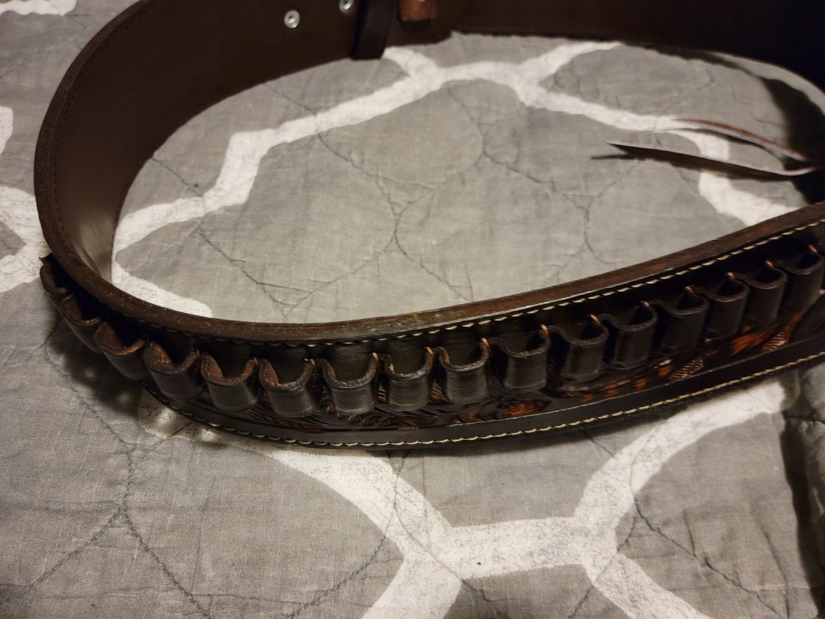 What it says in the title. Handmade in Tijuana, Mexico by a leather-worker I know. Beautiful hand-tooled belt and holster with ammo loops (semi-adjustable, should fit .357-.45 cases). Belt will fit up to ~40in waist.
