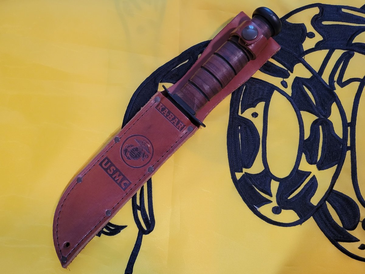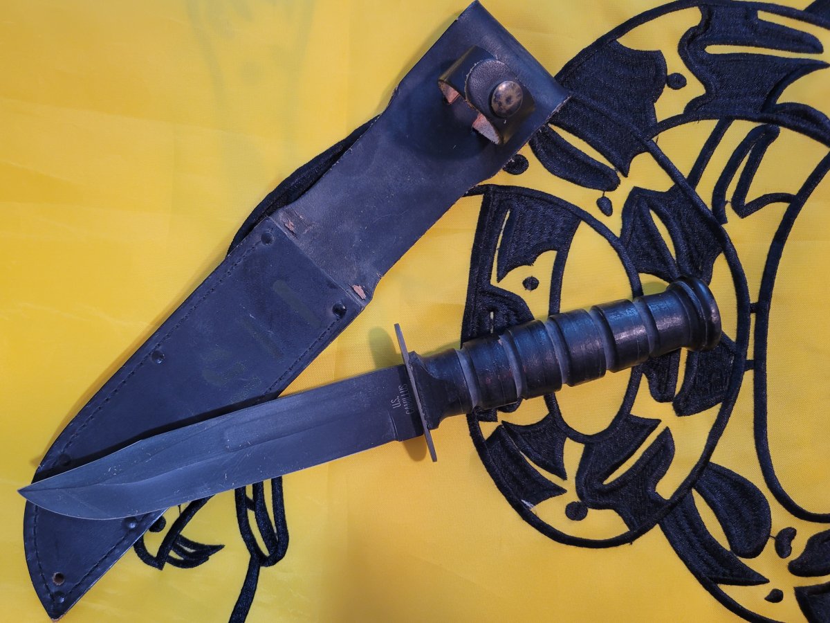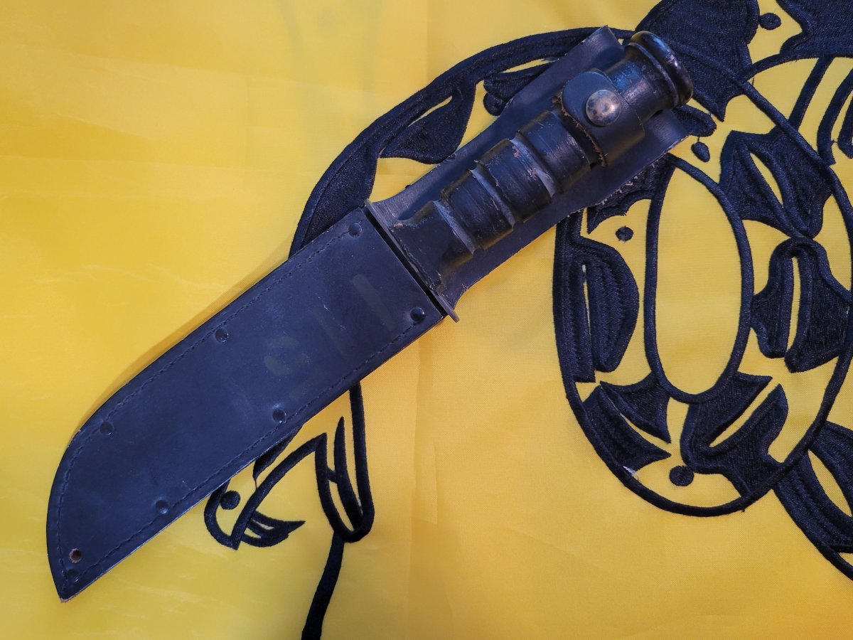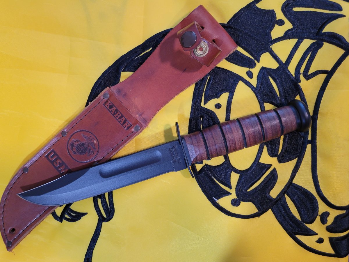 Basic Commercial K-Bar. USMC marked. MFG in Olean, NY. Never carried/sharpened Small light spot on EGA on Sheath. 90.00 SPF