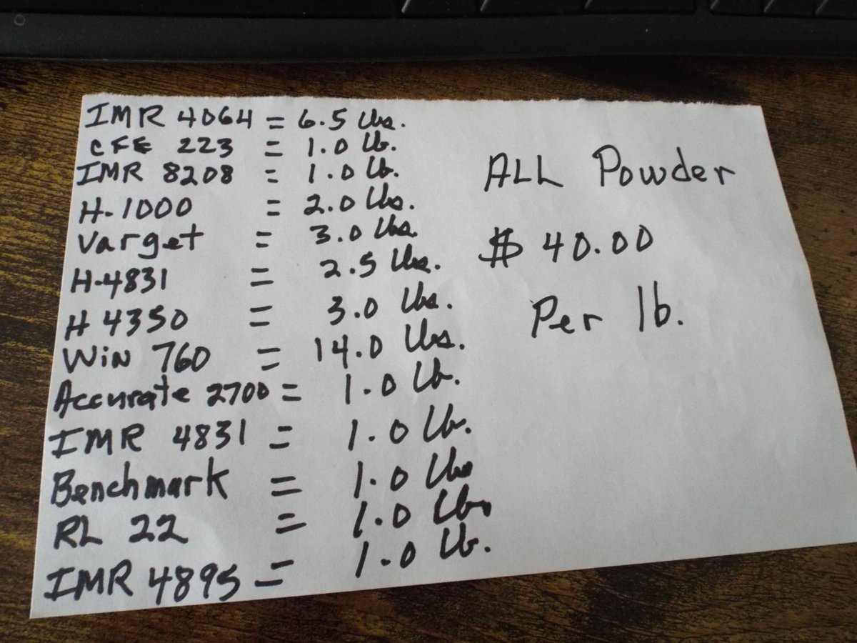 My rifles are all gone, now goes the powder. Of course, powder sales will be face-to-face in Carson City. All powder is $40 per lb. No discounts for volume buyers. It already is a great deal.