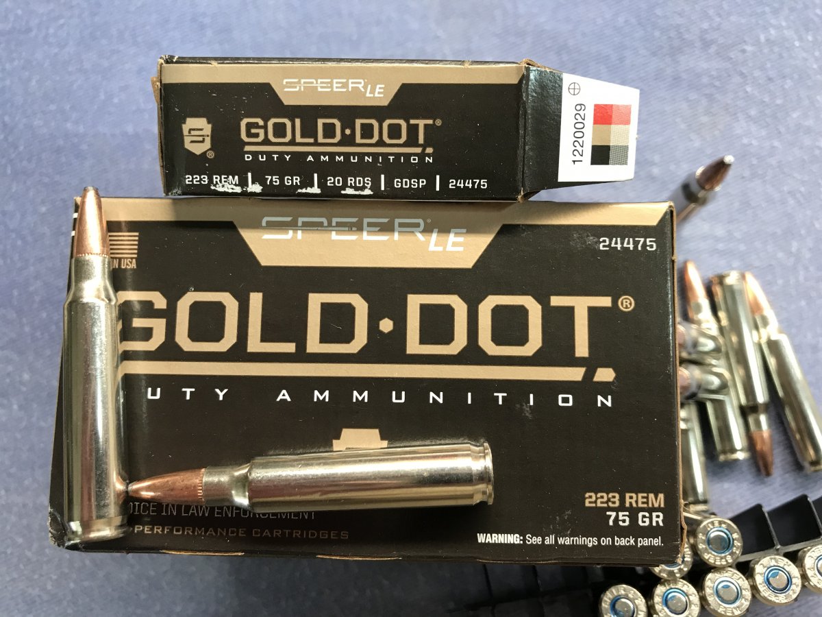 $28 for each 20 round box of Speer LE-duty Gold Dot 22475 223 Rem 75 grain Ni-cased Bonded SP.