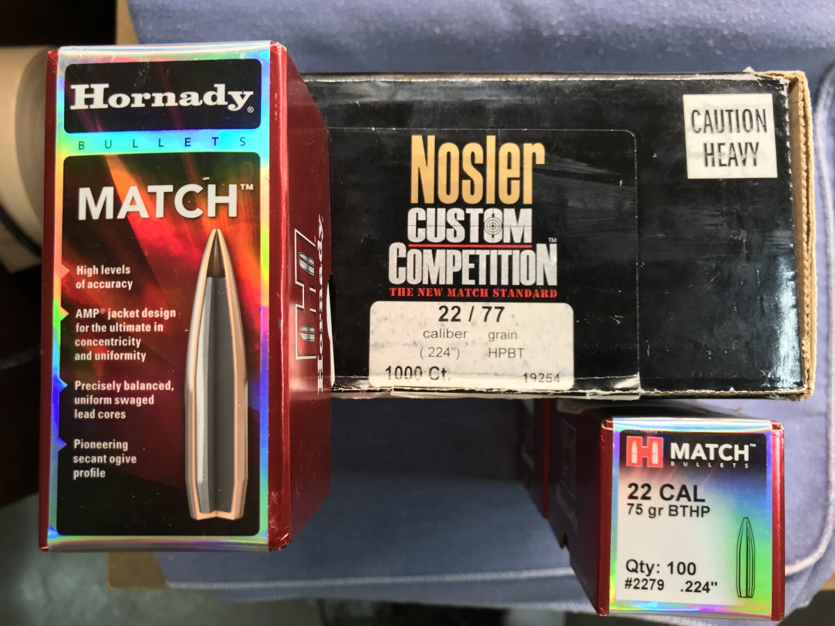 $160 for 700 bulk boxed Nosler Custom Competition HPBT Match 22 caliber .224 dia. 77 grain rifle slugs.