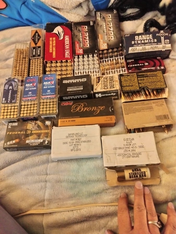 1 box 40mm 50 round $ 10.00 1 box 9mm 20 round and 1 box 9mm 25 round $5.00 1 box 9mm aluminum 40 rounds $10.00 and 1 box mixed 36 rounds $5.00 1 box 7.62×39 20 rounds $10.00 1box 223 50 rounds $20.00 1box 223 20 rounds $10.00 1 box 223 steel 14 rounds $5.00 1 box 223 brass 12 rounds $5.00 1 box 12 gauge 5 rounds $5.00 2 boxes 12 gauge bean bag 5 rounds $5.00