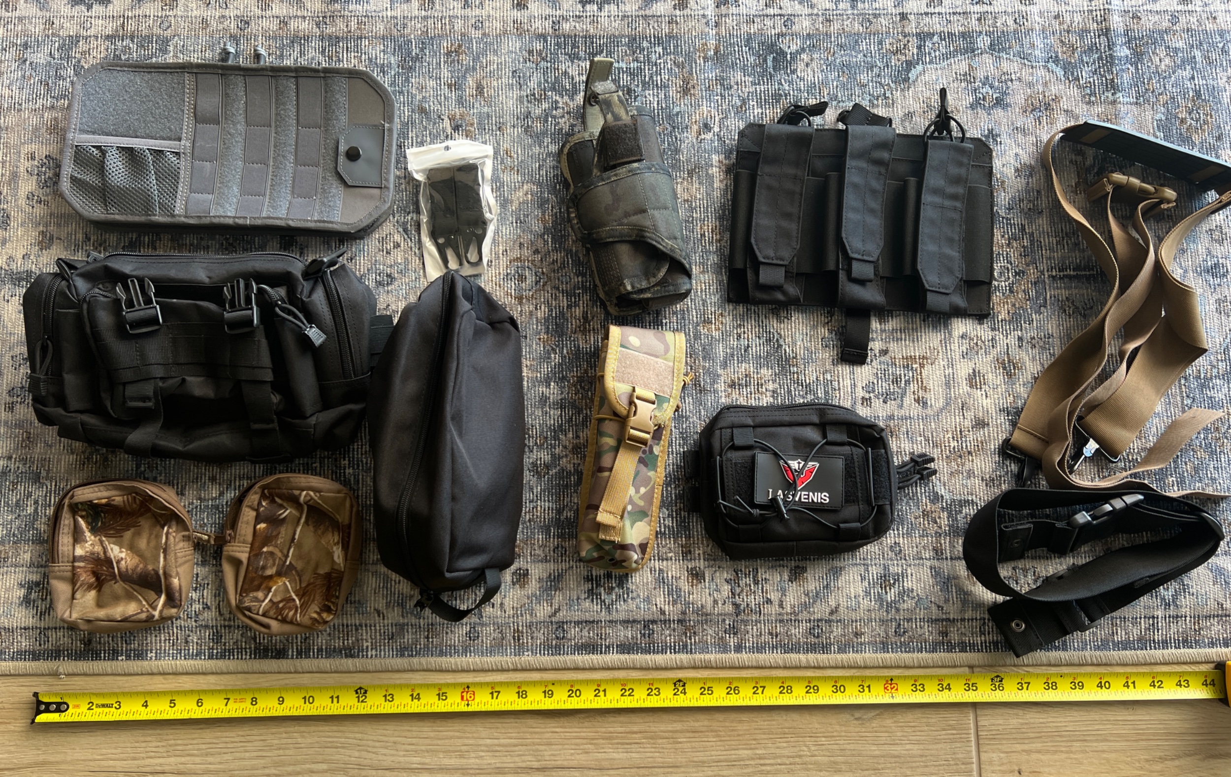 Also for sale: miscellaneous nylon pouches. I’m selling these as one entire lot to keep the sale easy. The lot consists of a gray visor (car/truck) zippered pouch (new), a small, black duffle-style pouch (molle, buckles, new), a black nylon toiletries pouch, two small camo pouches (used, one labeled “TQ”), two glove/equipment hooks for belts (new, black), one universal holster (accommodates pistols with lights, used but still sturdy and the camo pattern has been “customized” for night ops), a suppressor pouch (new, multicam-esque pattern), nylon/velcro rifle mag placard (new, velcro-backed, velcro-closure on an extra pocket behind the mag pouches), a black nylon admin pouch (zipper closure, molle, with shock cord on front) and three miscellaneous straps for bags, cases, etc. Price for all these items: $50/OBO.