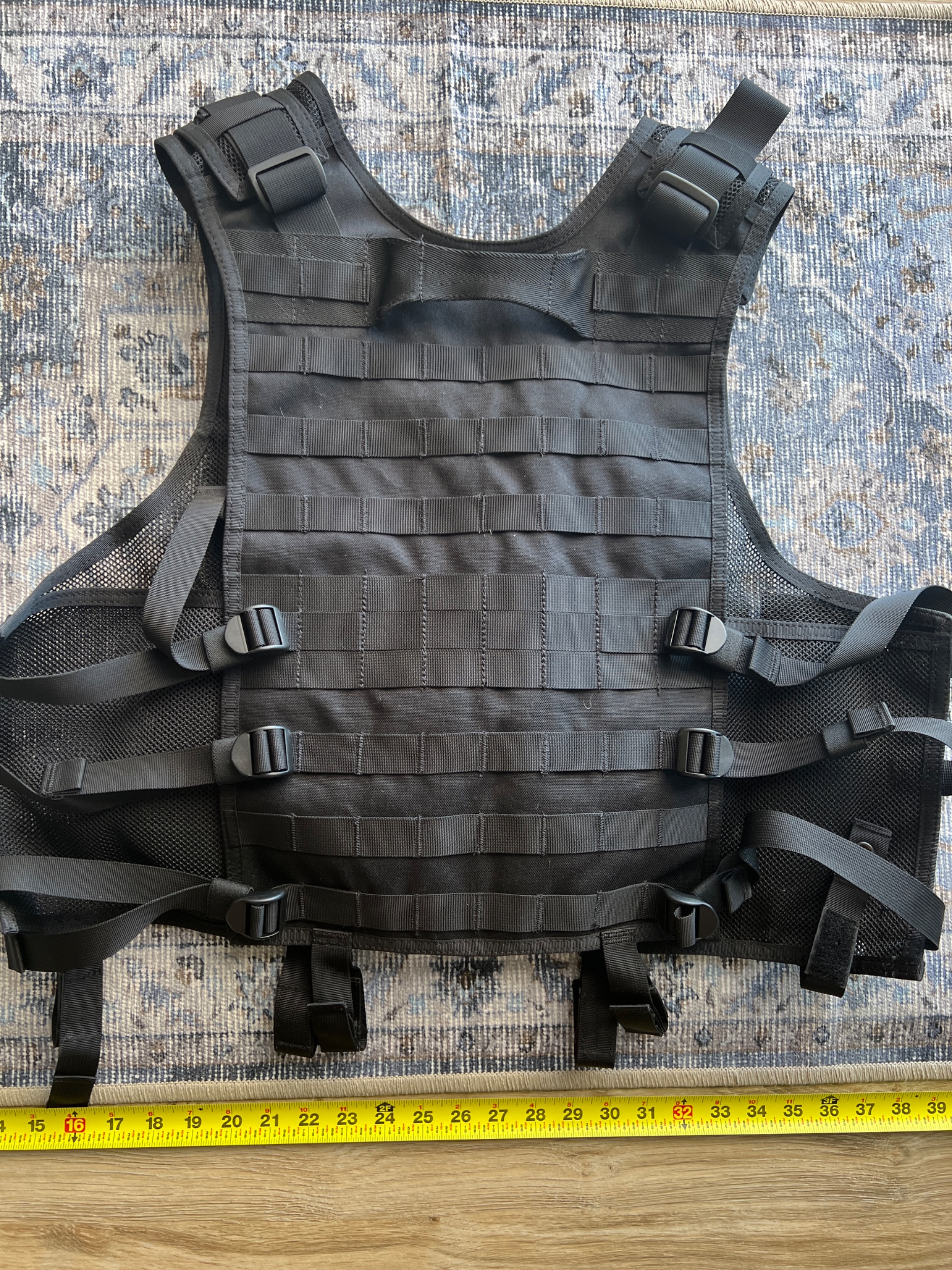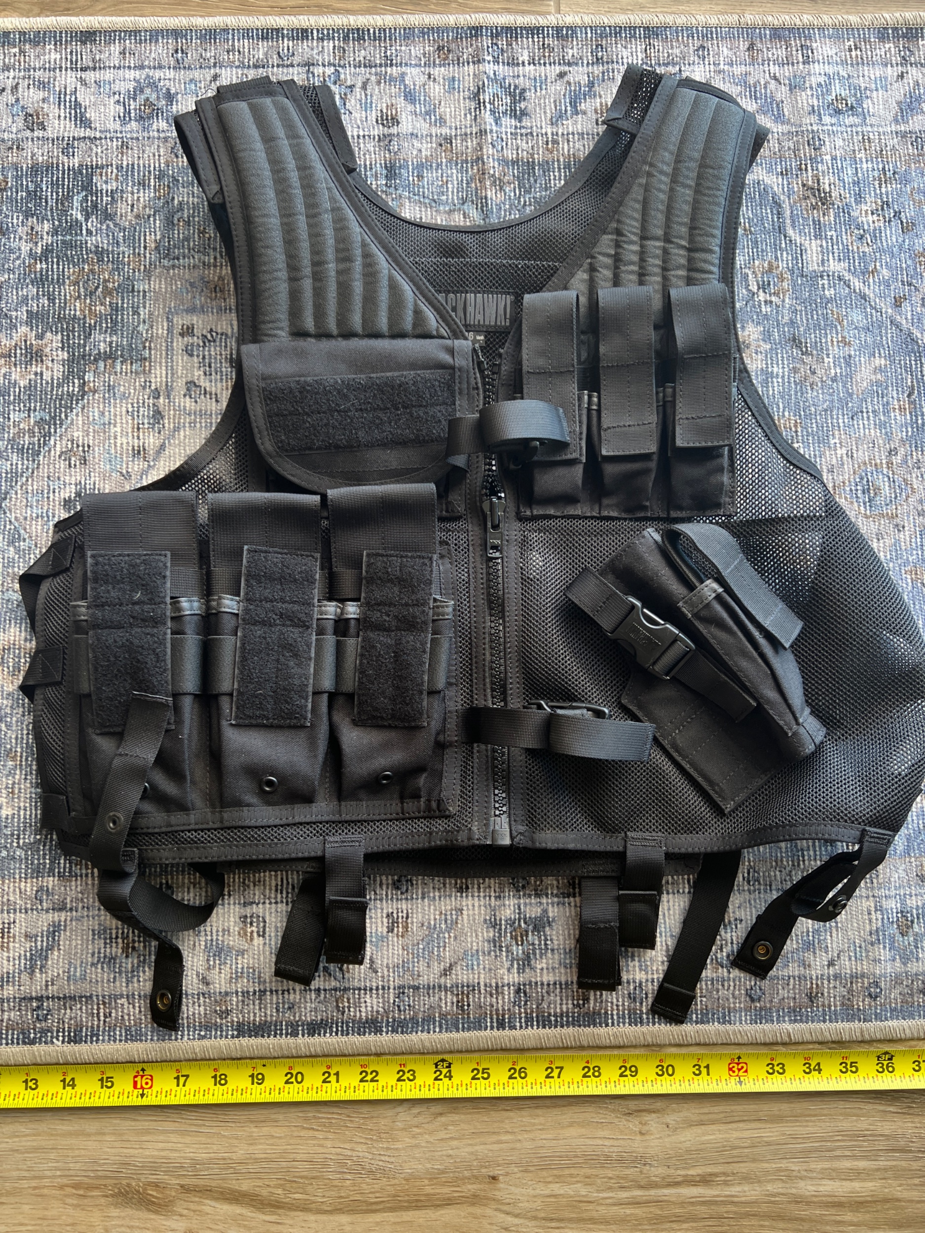For Sale: One Blackhawk Omega Elite tactical vest. Pouches and holster are integrated into the vest; righthand crossdraw holster, pistol mag pouches, rifle mag pouches, grippy areas for rifle butt and molle webbing on the backside. I believe I wore this on just one operation and then the team made a wholesale change-over to green uniforms and gear. All the velcro and buckles are in excellent condition, odor-free, the vest has been housed in a non-smoker home and the vest is in excellent condition. The tag indicates it is a size 26 (which I’m not familiar with) but I’d call it an XL, designed to fit over hard or soft armor. OpticsPlanet has one for sale for $150, I’m asking $100/OBO. Here’s a link: