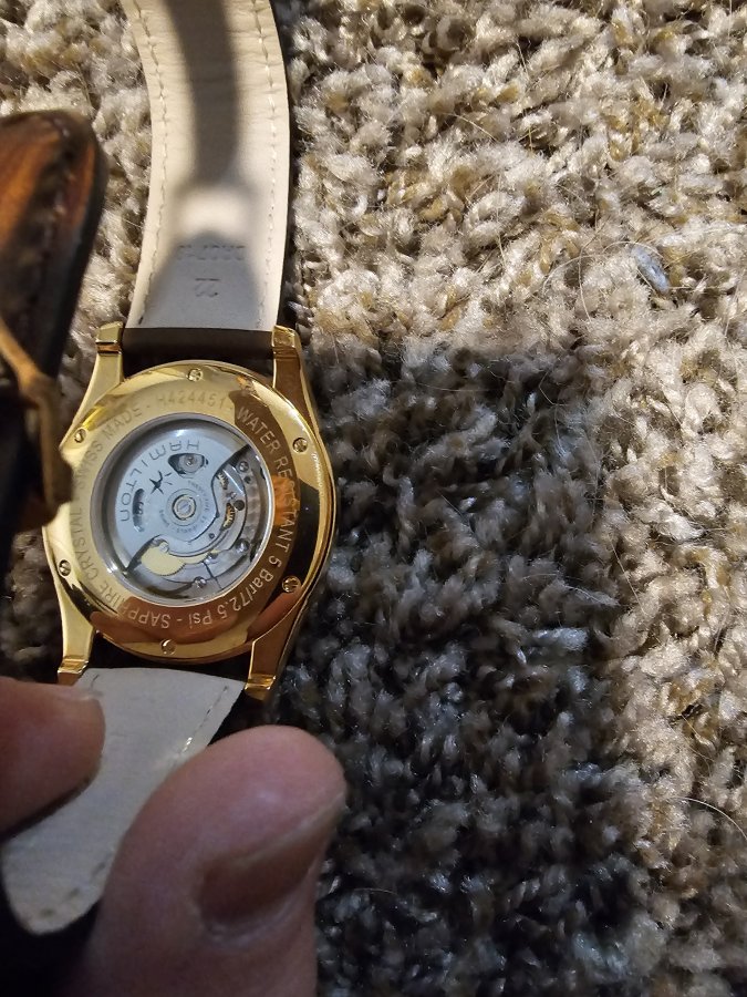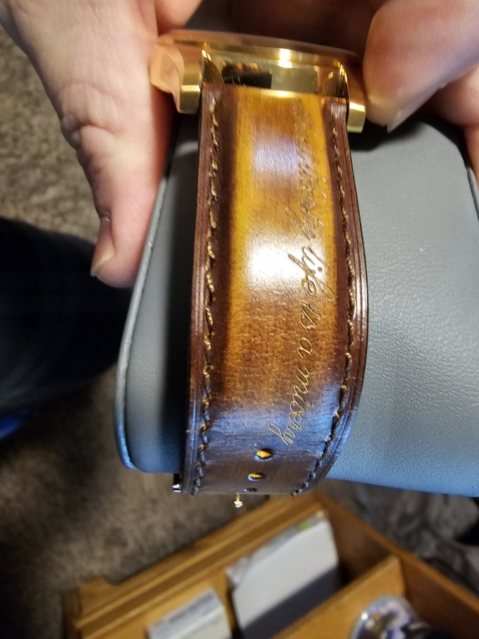 Purchased new a couple of years ago. Worn once or not at all. Swiss H10 Automatic movement. Gold-colored Stainless Steel case with engraved brown leather strap.