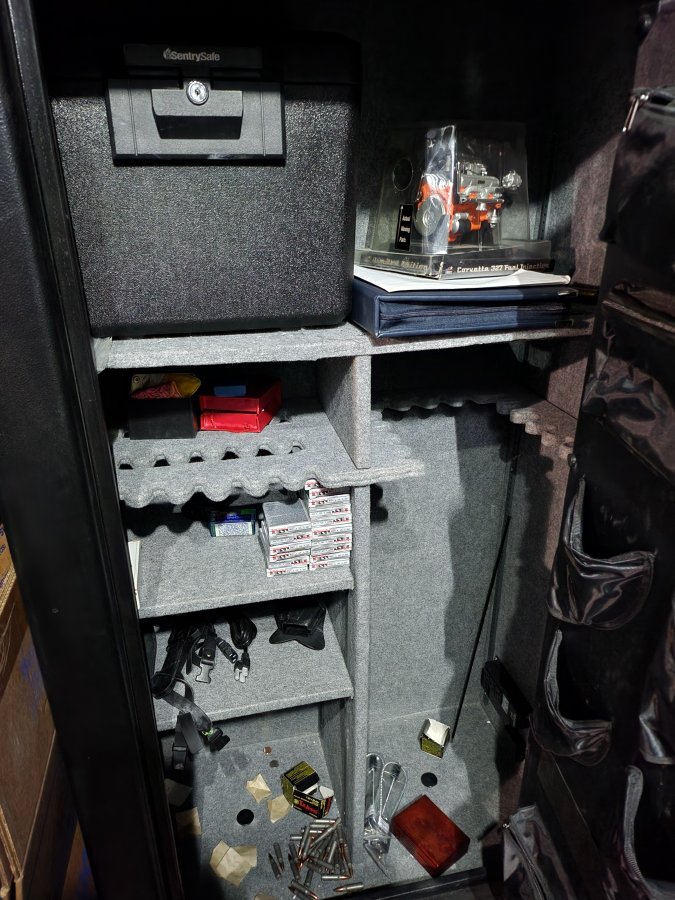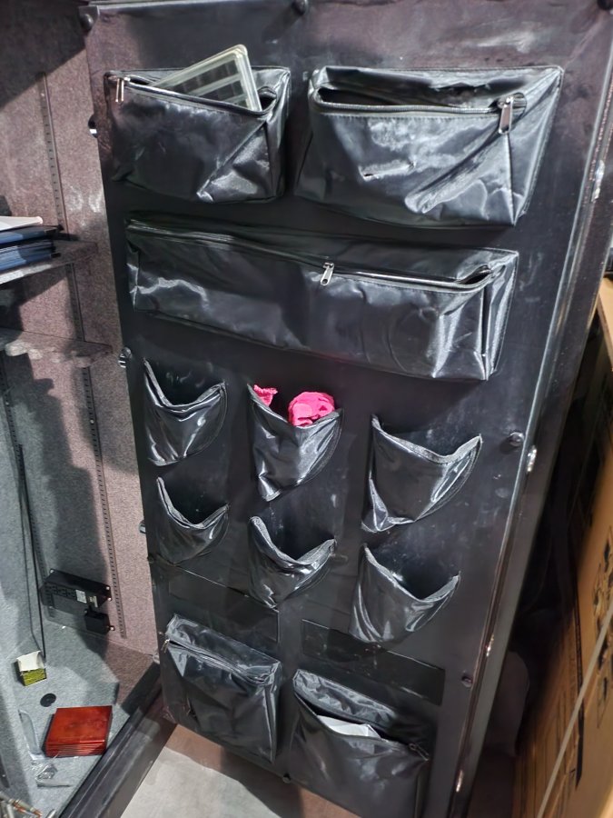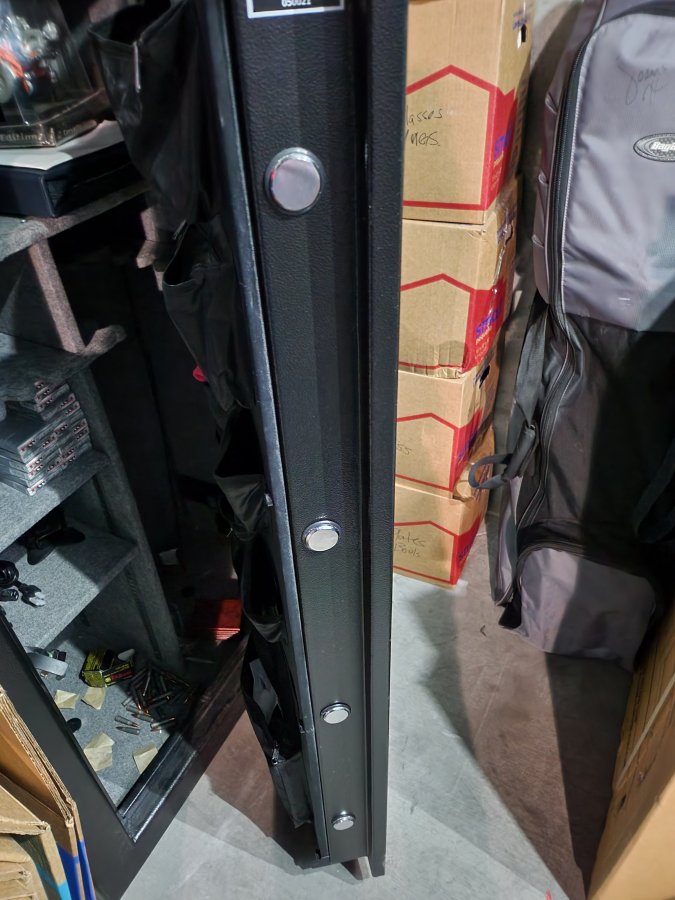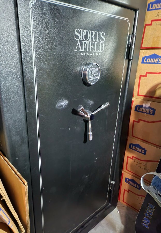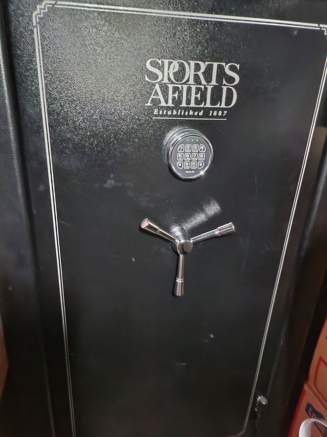 Sports Afield, (electronic tumbler) 33" Wide X 20" Deep (23" with frt mechanism) X 59" Tall, has built in A/C plug (dehumidifier, lighting, etc) Weighs 502 Lbs. Fire resistant to 1200 degrees for 3 hours; but most important keeping your Fire Arms, Weapons, Ammo, vital documents, heirlooms safe!