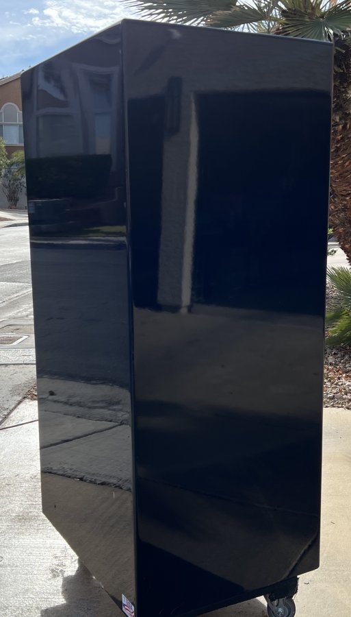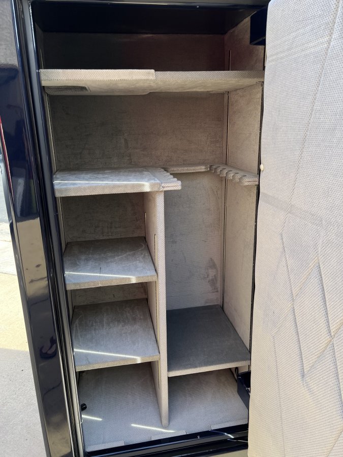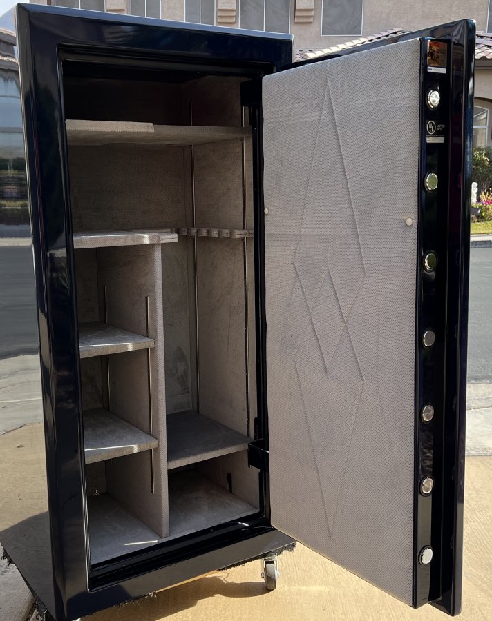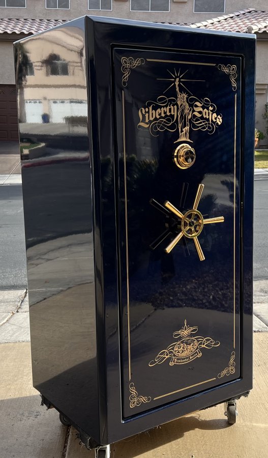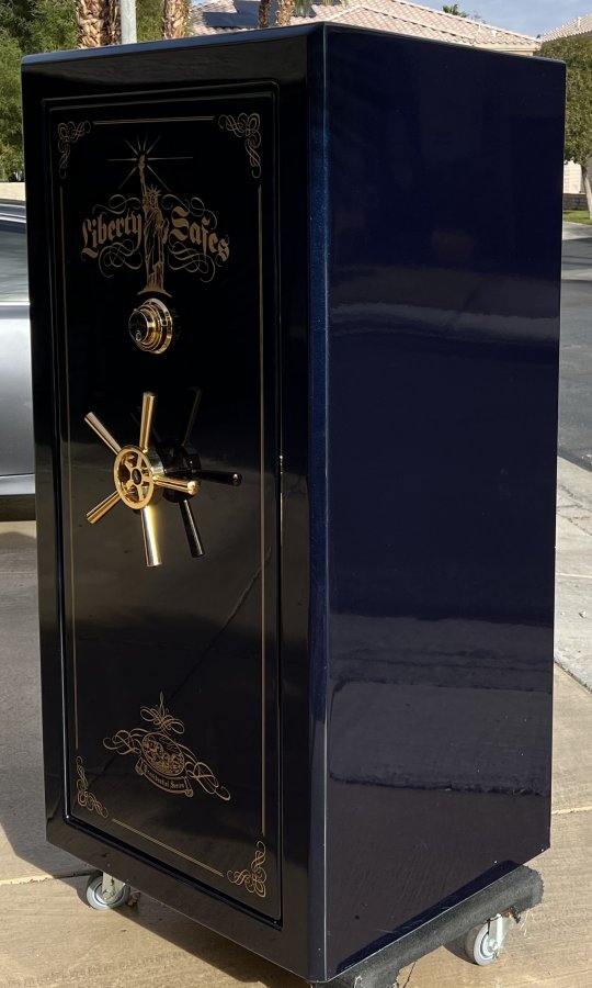 Liberty "Best in Class" Presidential 25 Gun Safe. Metallic blue exterior with modular grey interior and 24K gold hardware. Dimensions 60"H x 31.5"W x 25.5"D