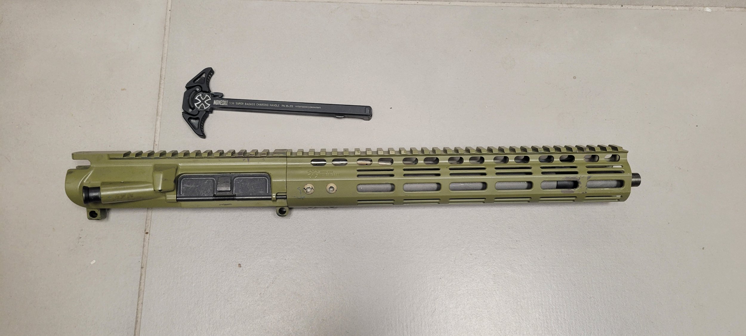Factory Gen3 Afghan midlength upper. Bazooka green cerakote, was painted then paint stripped so it has some tan paint residue. 14.5" Barrel was cut to 12.5" by D Wilson mfg. Less than 1000 rounds fired. Was $1300 new, selling for $600