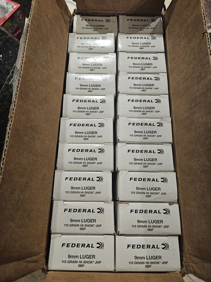 Case of Federal 115 gr hollow point ammo. $ 380. Would be willing to trade for a Gen 5 Glock 19 or 17, or a 19X. Also interested in an older Remington Model 7 in .243 or .308, wood stock with iron sights.