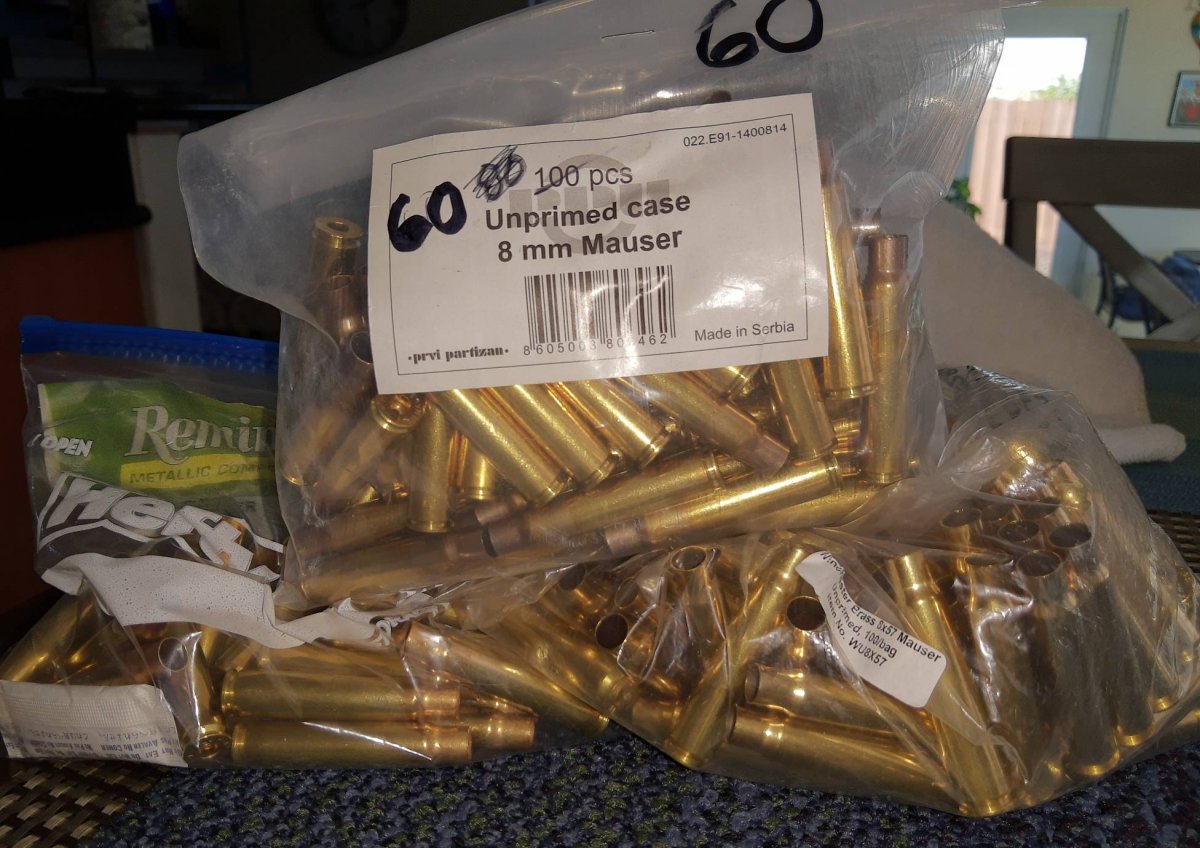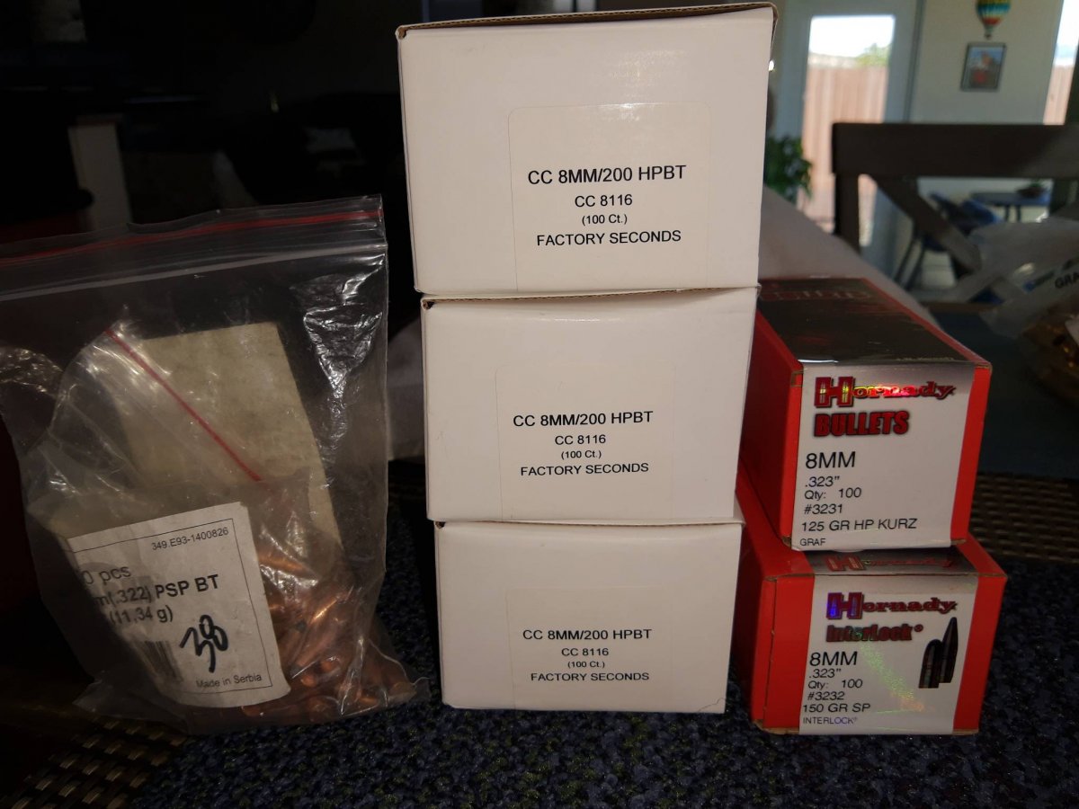 Bullets. Hornady #3231 .323 125gr HP Kurz (100). Hornady #3232 .323 150gr SP (57). Prvi .322 PSP 175 BT (38). Nosler HPBT 200gr CC Factory 2nds (300)