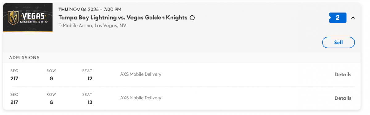 $65 - SELLING AS A PAIR! Tickets are priced as essentially buy one ticket, get one free ticket ( I could use the cookie jar money for the new baby more than I need to catch the Knights game)