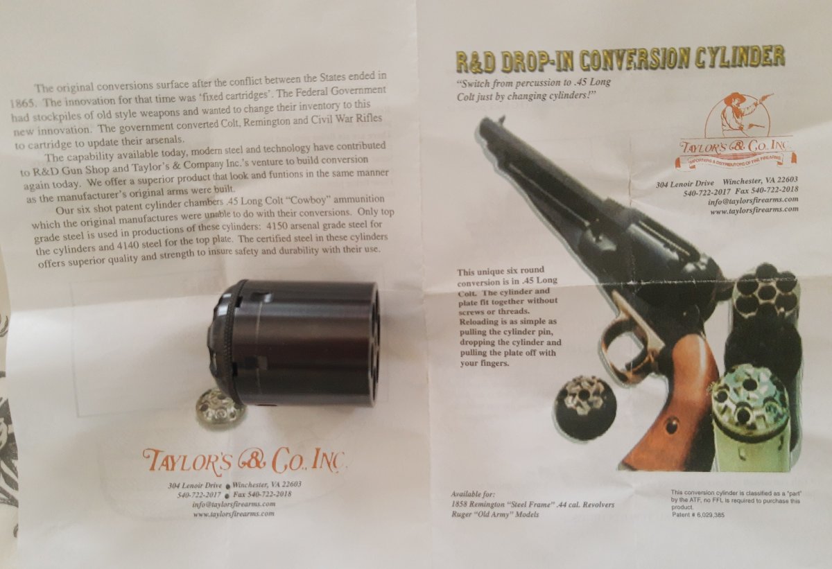 Taylor's & Company Conversion Cylinder 44 Caliber Pietta 1858 Remington Steel Frame Black Powder Revolver 45 Colt. Unused. $200