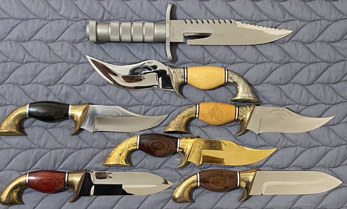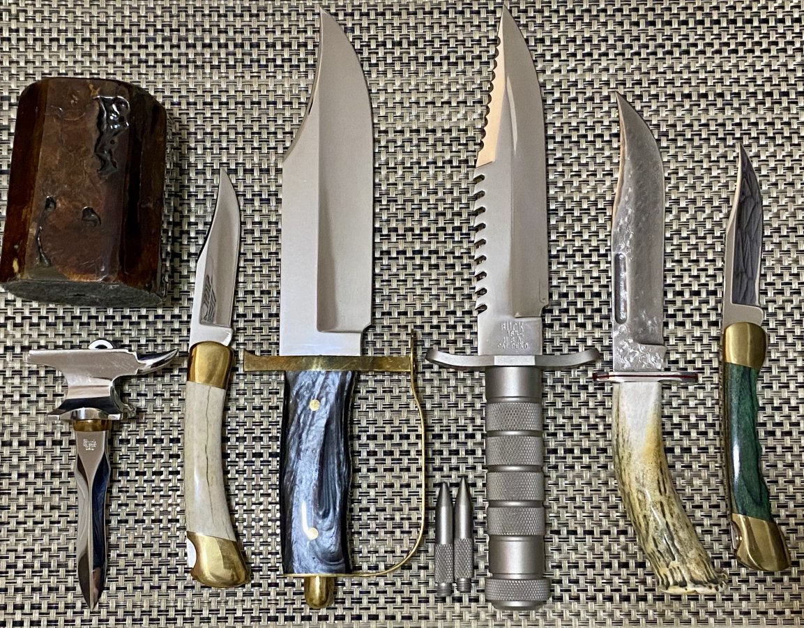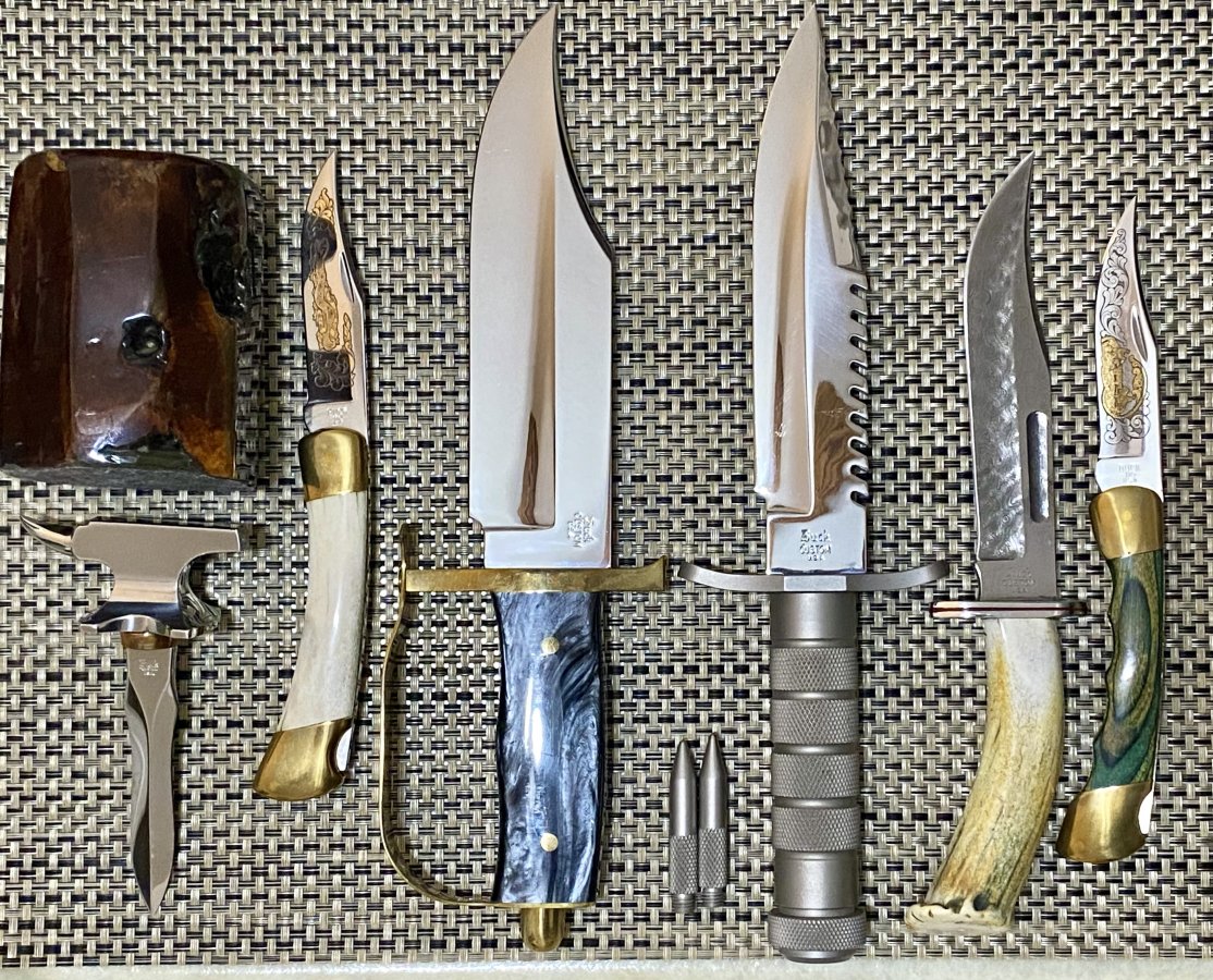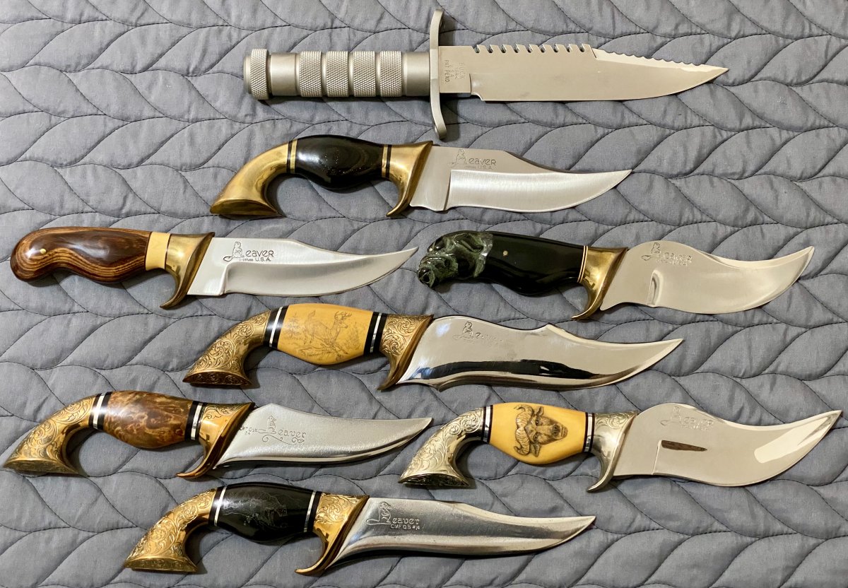 Custom Made Fighting Knives 70’s - 80’s by Manny Silva and Sonny Guiler of Beaver USA and Iron Mountain Knife Company. Each of these are handcrafted from modified 425 SS, custom fitted with scrimshaw patterns on Guard and Pommel. Exotic Woods are used on these. One has a carved head of a Black Panther at the pommel, a few with Mallards Head Brass Pommels. Blade designs are from one off Style, to Stinger, Cape Buffalo, Dagger, and Drop Point. The latter two are the first of the run each with serial numbers 001. Blades are mirror polished. One of the Buffalo Knife is double manufactured marked on each side by Beaver USA and Iron Mountain Knife Company on the other. There’s a storyline behind this but for another time. One of the Stinger knife is Gold Plated. Picture of the Buckmaster is for size reference only.