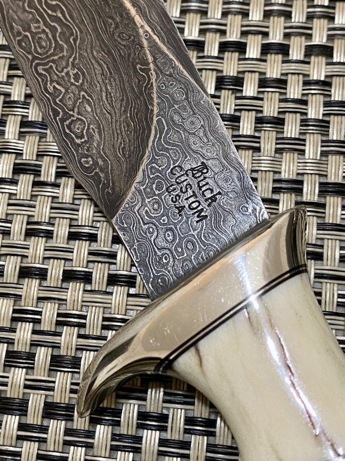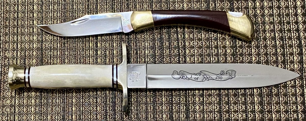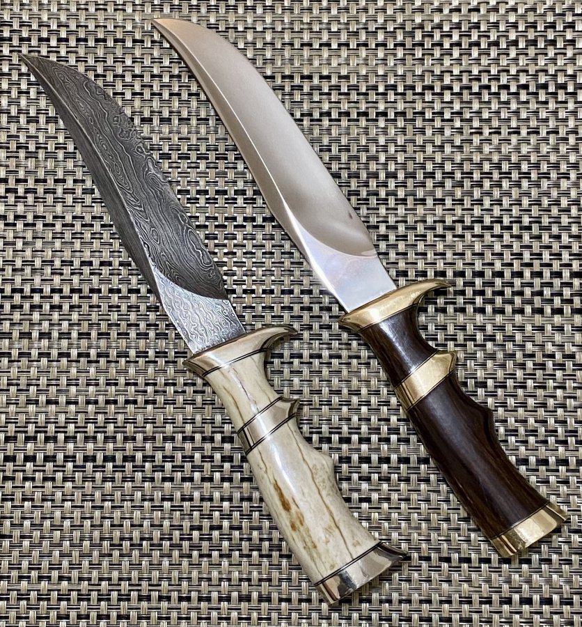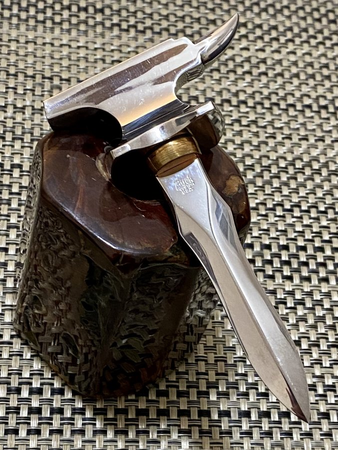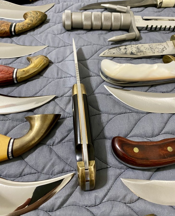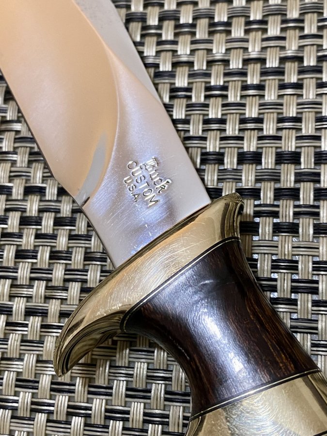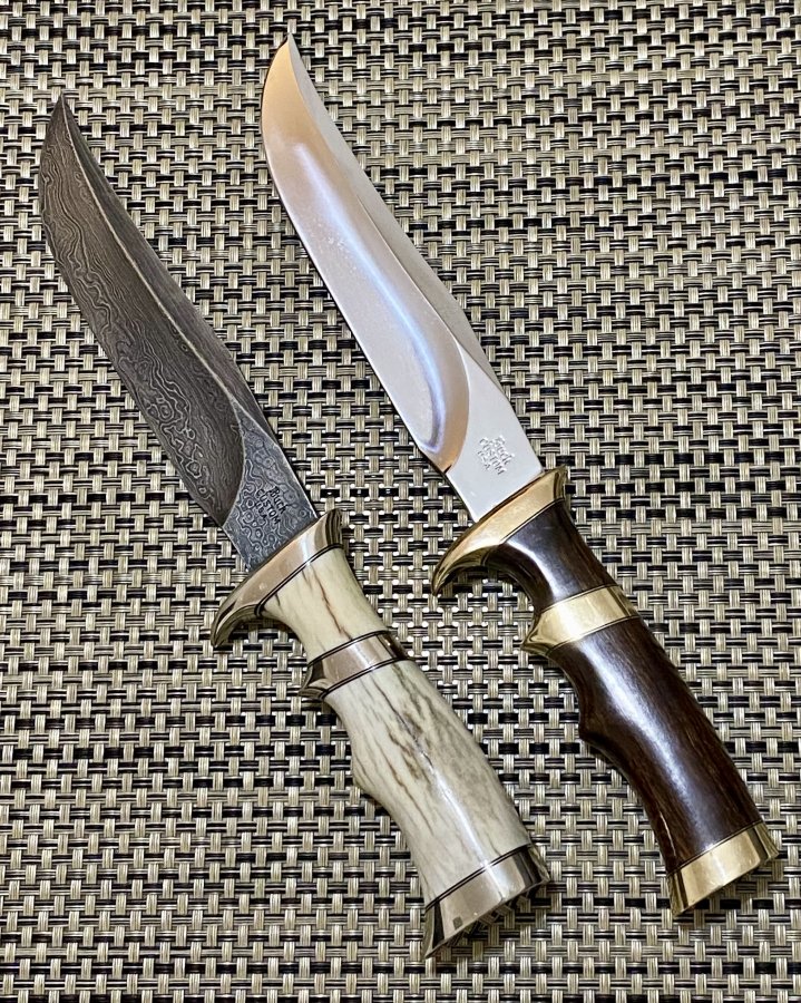 Custom Made Fighting Knives 70’s - 80’s by Manny Silva and Sonny Guiler of Beaver USA and Iron Mountain Knife Company. Each of these are handcrafted from modified 425 SS, custom fitted with scrimshaw patterns on Guard and Pommel. Exotic Woods are used on these. One has a carved head of a Black Panther at the pommel, a few with Mallards Head Brass Pommels. Blade designs are from one off Style, to Stinger, Cape Buffalo, Dagger, and Drop Point. The latter two are the first of the run each with serial numbers 001. Blades are mirror polished. One of the Buffalo Knife is double manufactured marked on each side by Beaver USA and Iron Mountain Knife Company on the other. There’s a storyline behind this but for another time. One of the Stinger knife is Gold Plated. Picture of the Buckmaster is for size reference only.