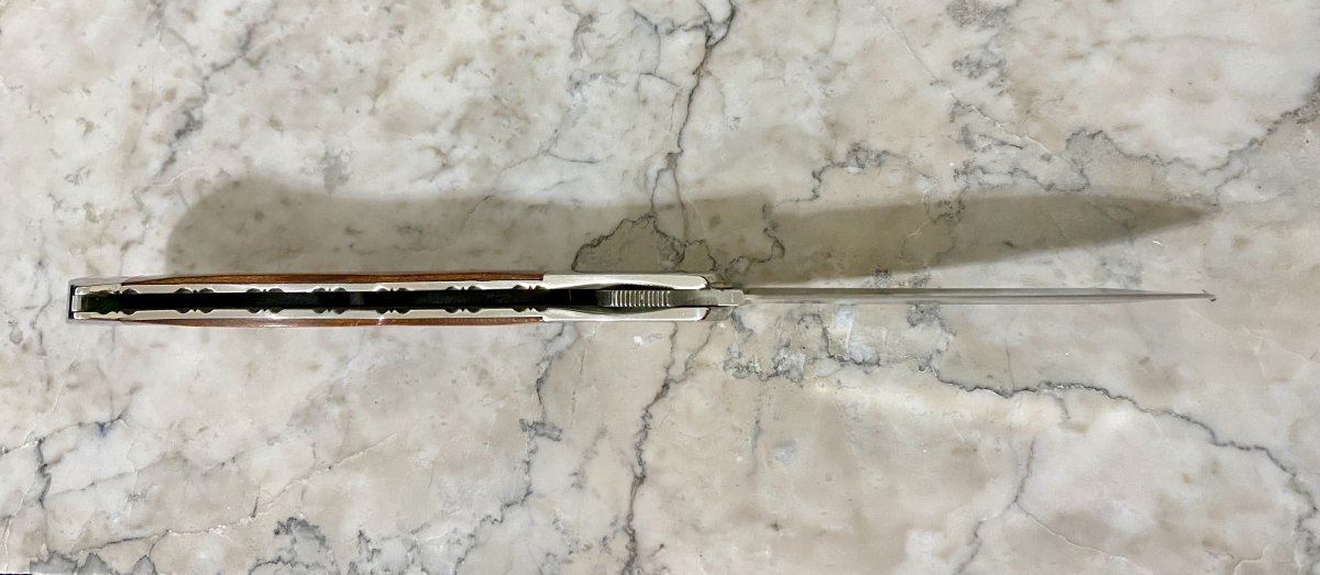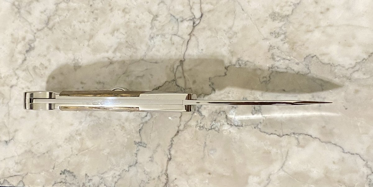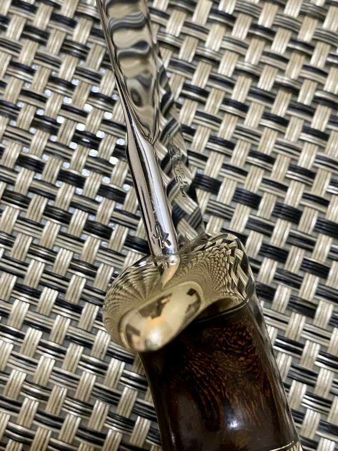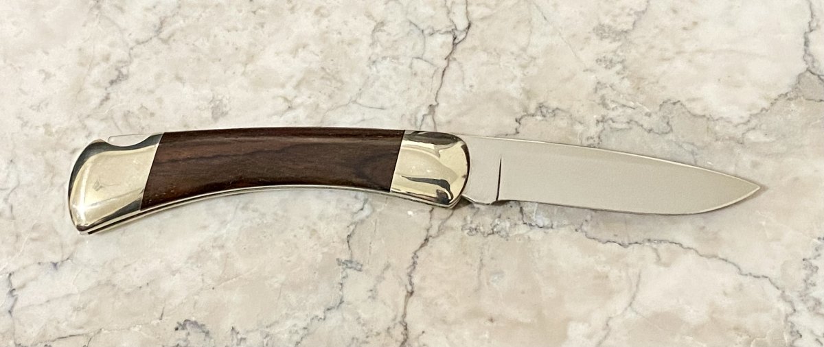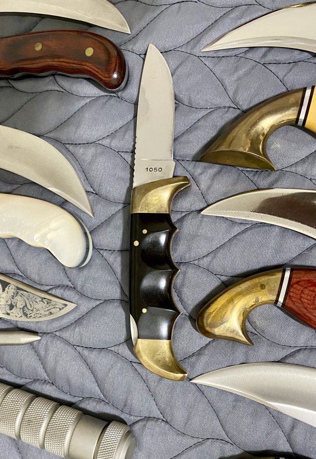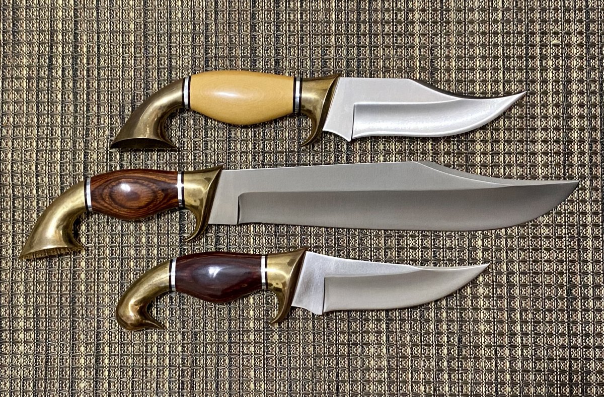 Custom Made Fighting Knives 70’s - 80’s by Manny Silva and Sonny Guiler of Beaver USA and Iron Mountain Knife Company. Each of these are handcrafted from modified 425 SS, custom fitted with scrimshaw patterns on Guard and Pommel. Exotic Woods are used on these. One has a carved head of a Black Panther at the pommel, a few with Mallards Head Brass Pommels. Blade designs are from one off Style, to Stinger, Cape Buffalo, Dagger, and Drop Point. The latter two are the first of the run each with serial numbers 001. Blades are mirror polished. One of the Buffalo Knife is double manufactured marked on each side by Beaver USA and Iron Mountain Knife Company on the other. There’s a storyline behind this but for another time. One of the Stinger knife is Gold Plated. Picture of the Buckmaster is for size reference only.