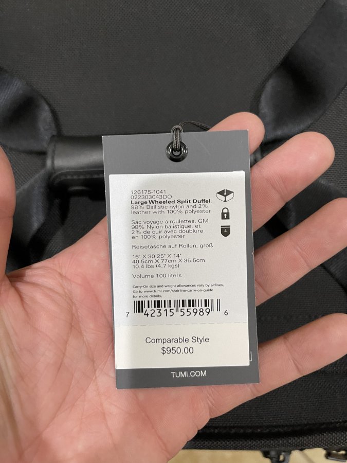Brand New, still in plastic Tumi Split Duffel. Picture of the tag is uploaded so you can see weight and all dimensions. Great to use for traveling.
